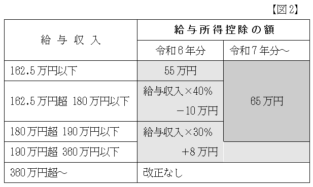 ①にあるように、令和7年から基礎控除が改正されたことに加え、給与所得控除も図2のとおり改正されました。